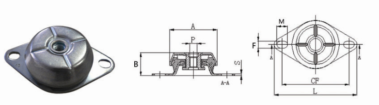 型號 | 橡膠硬度 IRHD (daN/mm) | A | B | P | F*M | CF | L | S | Average Stiffness平均值負荷(Kg/mm) | Max Load最大荷重(Kg) | Max Deflec.最大壓縮量(mm) |