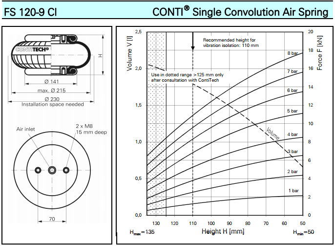 橡膠氣囊工作時,內(nèi)腔充入壓縮空氣,形成一個壓縮空氣氣柱。隨著振動載荷量的增加,彈簧的高度降低,內(nèi)腔容積減小,彈簧的剛度增加,內(nèi)腔空氣柱的有效承載面積加大,此時彈簧的承載能力增加。當振動載荷量減小時,彈簧的高度升高,內(nèi)腔容積增大,彈簧的剛度減小,內(nèi)腔空氣柱的有效承載面積減小,此時彈簧的承載能力減小。這樣,空氣彈簧在有效的行程內(nèi),空氣彈簧的高度、內(nèi)腔容積、承載能力隨著振動載荷的遞增與減小發(fā)生了平穩(wěn)的柔性傳遞、振幅與震動載荷的高效控制。還可以用增、減充氣量的方法,調(diào)整彈簧的剛度和承載力的大小,還可以附設(shè)輔助氣室,實現(xiàn)自控調(diào)節(jié)。