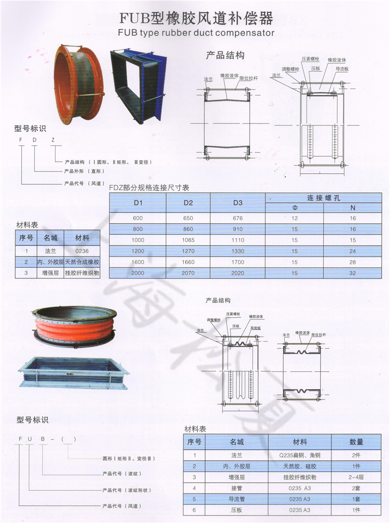 風道橡膠補償器分為FDZ、FVB、FUB、XB四種型號,由橡膠和橡膠一纖維織物復合材料、鋼制法蘭、套筒、保溫隔熱材料組成,主要用于各種風機、風管之間的柔性連接,其功能是減震、降噪、密封、耐介質、便于位移和安裝,是環(huán)境保護領域中一種較為理想的減震、降噪、消煙除塵的配套件。
