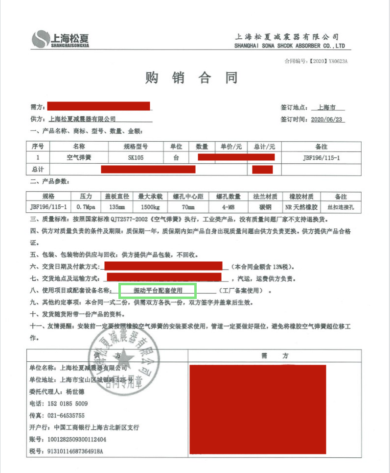上海松夏減震器有限公司官方網(wǎng)站為您介紹:【震動平臺配套】使用上海松夏JBF196/115-1采購合同信息,我們松夏公司2020年為【震動平臺配套】使用上海松夏JBF196/115-1,起到了減震和降噪的作用,以下是【震動平臺配套】使用上海松夏JBF196/115-1采購合同介紹